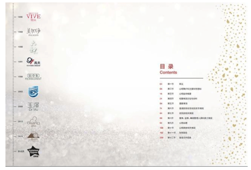 除了公司“明星產(chǎn)品”及“明星代言人”被用作年報各章節(jié)首頁的背景圖外,上海家化這份年報全文均采用“印刷色”模式,數(shù)據(jù)、表格的排版布局也讓人耳目一新。
